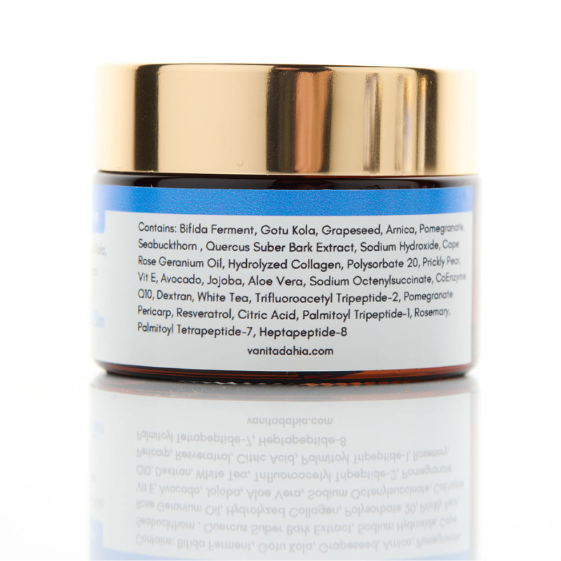 Bifida Ferment, Gotu Kola, Grapeseed, Arnica, Pomegranate, Seabuckthorn , Quercus Suber Bark Extract, Sodium Hydroxide, Cape Rose Geranium Oil, Hydrolyzed Collagen, Polysorbate 20, Prickly Pear,